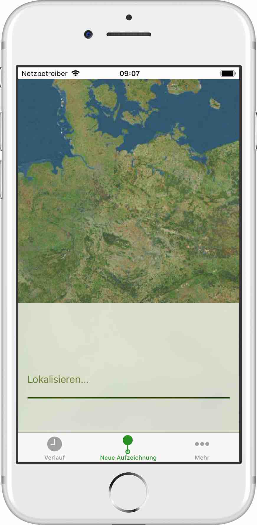 Hektar.app wartet solange mit der Aufzeichnung, bis ein gutes GPS Signal gefunden ist. Während dieser Zeit wird der Hinweis »Lokalisiere…« angezeigt. Er weist auch auf die aktuelle Signalqualität hin.