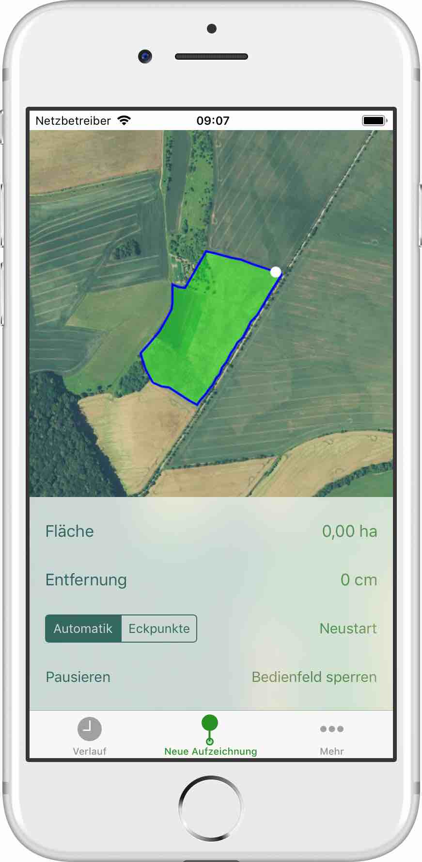Wenn du dich fortbewegst entsteht die Kontur einer Fläche. Sie wird in ein Luftbild projiziert und markiert zugleich deine aktuelle Position. Zusätzlich erscheint ein Bedienfeld, um die Aufzeichnung zu steuern.