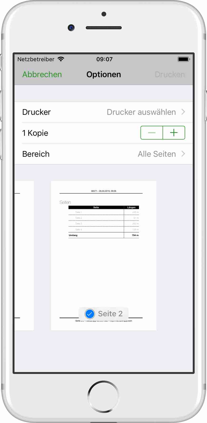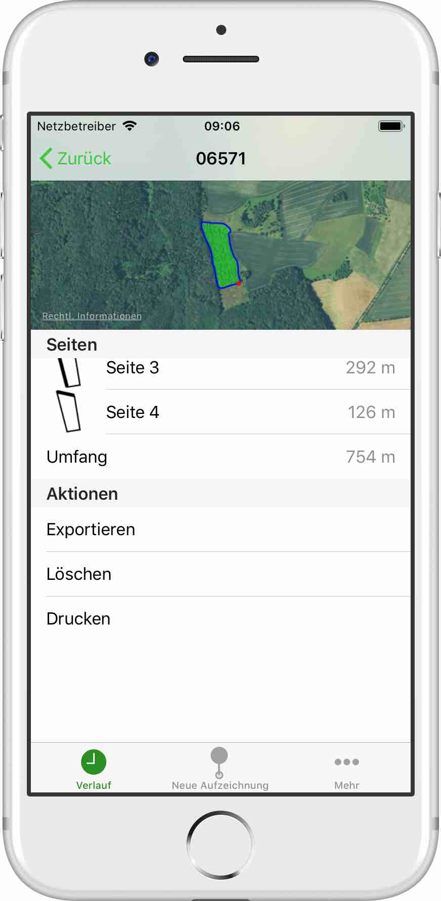 Es werden zwei Blätter gedruckt: Auf dem ersten Blatt erscheint die Kontur der Aufzeichnung und eine Übersicht mit Name, Flächengröße, Aufzeichnungsdatum sowie den Geo-Referenzdaten des Startpunktes. Das zweite Blatt enthält die »Seiten«. Jede Seite der Fläche wird durchnummeriert mit ihrer Länge angezeigt und zur Orientierung in der jeweiligen Flächenskizze fett hervorgehoben. Die Summe der Längen wird als Umfang ausgewiesen.